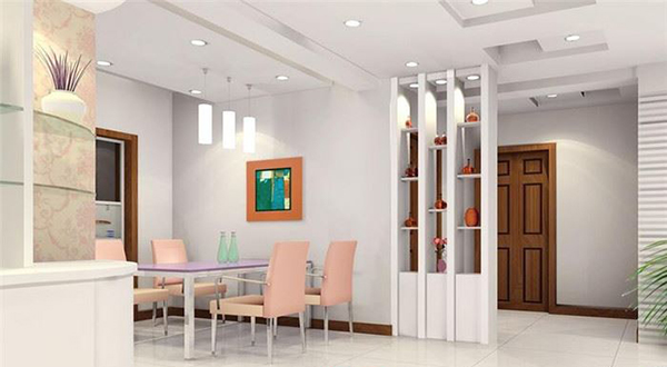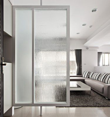 該形式設計用大屏玻璃作裝飾遮隔,或在夾板貼面旁嵌飾噴砂玻璃、壓花玻璃等通透的材料,既可以分隔大空間,又能保持整體空間的完整性。