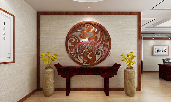 該形式以隔斷下部為完全遮蔽式設計。隔斷兩側隱蔽無法通透,上端敞開,貫通彼此相連的天花頂棚。通過線條的凹凸變化,墻面掛置壁飾或采用浮雕等裝飾物的布置,從而達到濃厚的藝術效果 。