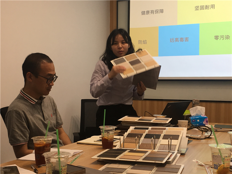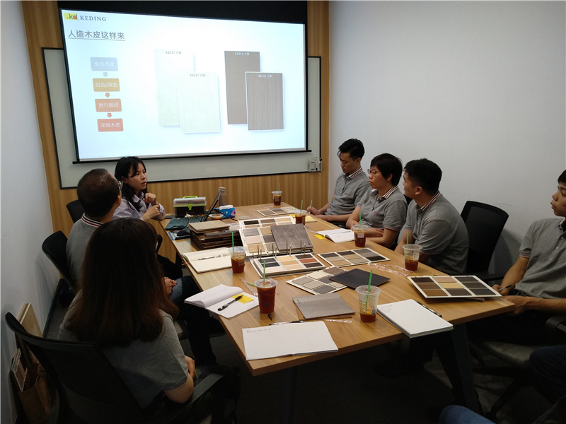 2019年3月22日下午,在珠海環藝裝飾設計部開展了《KD木皮板的認識與交流》分享會。本次分享會,邀請到臺灣科定集團珠海分公司章丹燕小姐進行主講。