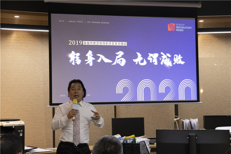 2019年終藝術分享會由珠海環藝總經理靳越暉先生主持。此次受邀前來的參加分享會的嘉賓有:中國美術家協會會員、著名油畫家王國俊先生;上世紀八十年代畢業于中國陶瓷大學的書畫家、教授伍斌先生;中國工藝美術協會特聘(琉璃)藝術家周元學先生;北師大珠海分校工業設計系版畫家左景武先生。珠海環藝裝飾設計師們參加了此次分享會,并與演講嘉賓進行了有關藝術與設計方面的深入交流。